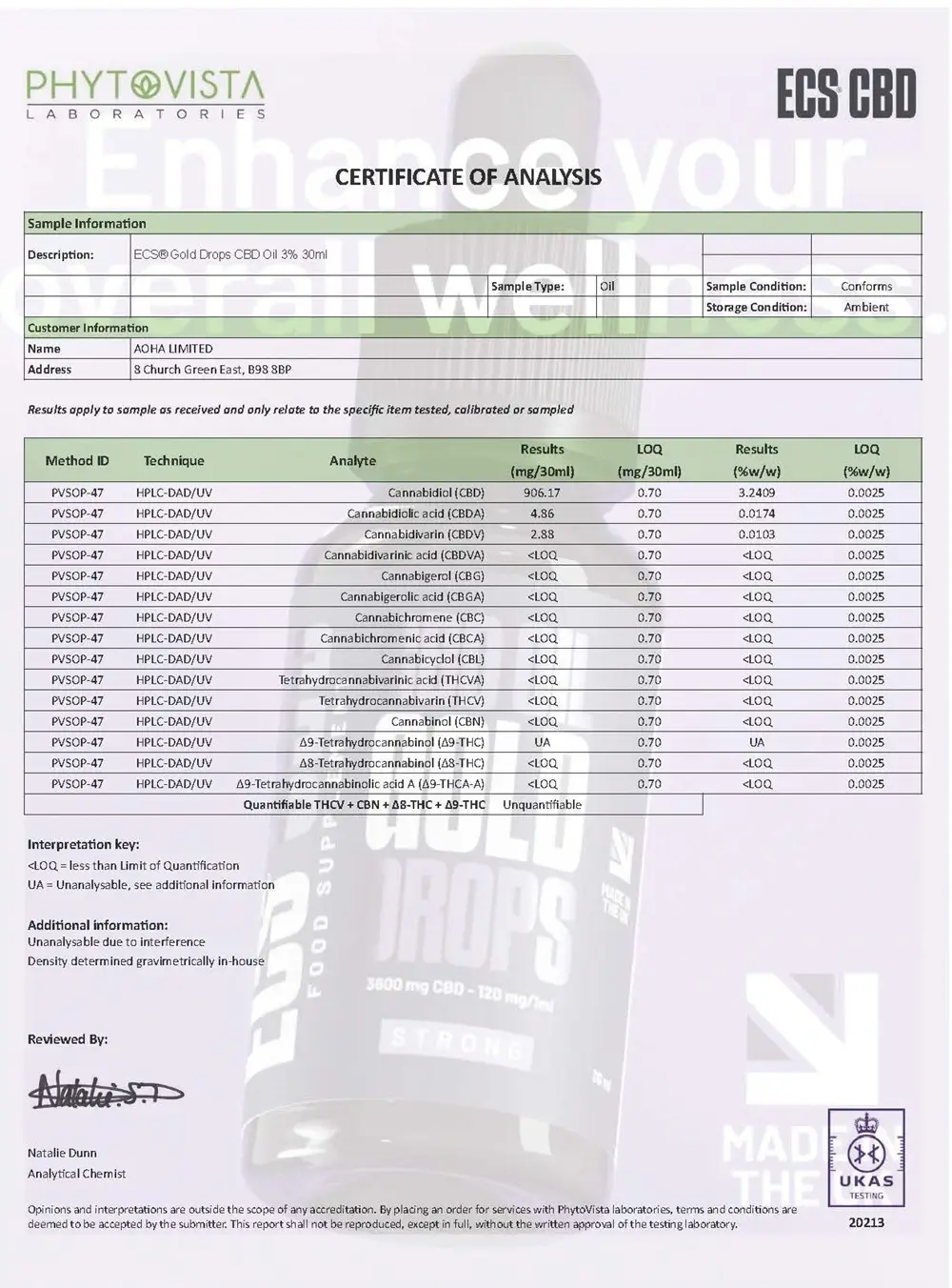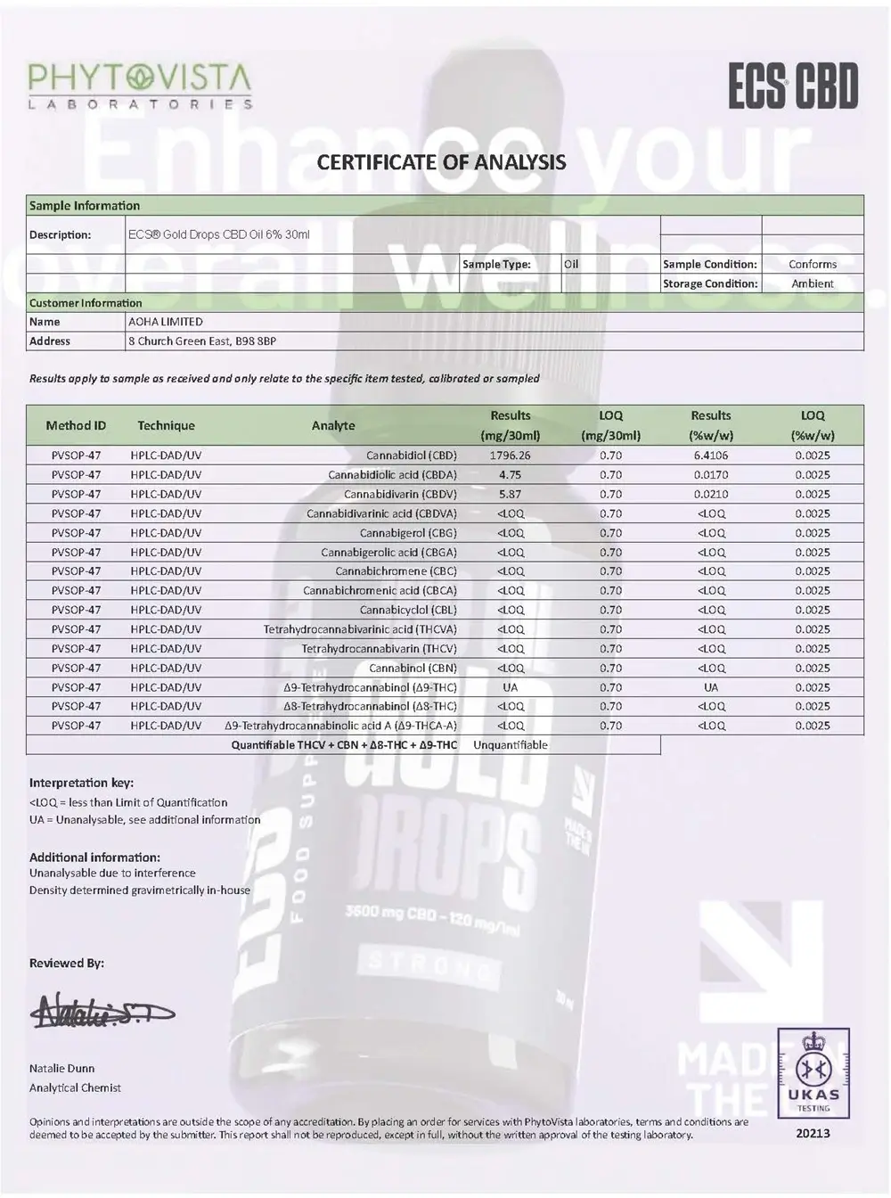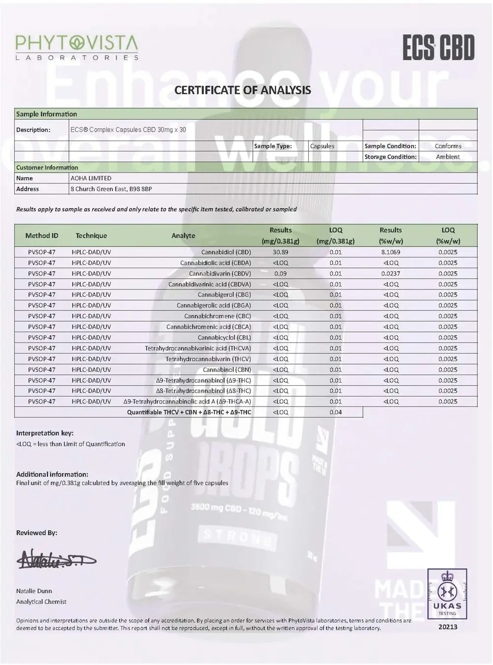 ECS CBD products are batch tested to confirm cannabinoid content, purity and compliance with UK regulations. Independent laboratory analysis is used to verify that product formulations accurately reflect label claims and remain THC-free.